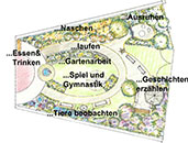So kann man im Garten Essen und Trinken, eine Runde laufen, Gartenarbeit ausführen, Naschen, sich ausruhen, in der Gruppe Geschichten erzählen, Spielen und Gymnastik machen sowie Tiere beobachten. Ein Brunnen lockt auf die Terrasse, gelbe Sommerstauden führen zu Beeren und Gemüse. Ein Rosenbogen zeigt den Weg zu einem kleinem Rückzugsraum, wo weiße Pflanzen entspannend und beruhigend wirken. Ein Pavillon umrahmt von Duftrosen, Flieder, und Pflanzen in Rosa und Violett läßt romantische Gefühle aufkommen. Vogelhaus, Duft- und Fühlpflanzen wecken die Neugier und blaue Vergissmeinnicht, Storchschnabel und Katzenminze stimmen fröhlich und beleben den Geist.